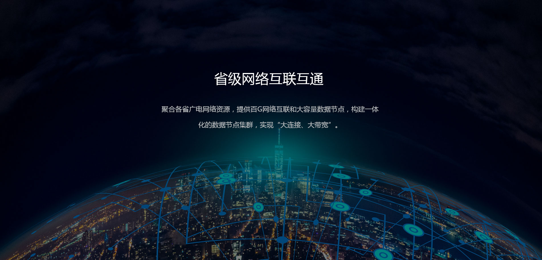 聚合各省廣電網(wǎng)絡(luò)資源,提供百G網(wǎng)絡(luò)互聯(lián),構(gòu)建全國性省際網(wǎng)絡(luò)互聯(lián)互通與數(shù)據(jù)節(jié)點等基礎(chǔ)服務;基于大連接與大數(shù)據(jù)融合的業(yè)務模式,提供廣電特色的數(shù)據(jù)技術(shù)服務。